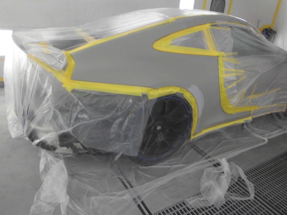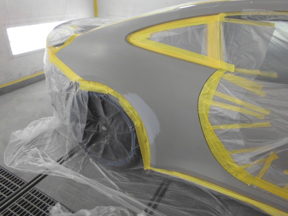 ゴミや埃の混入を防いだ塗装ブース内で、リアフェンダーの仕上げ塗装を行います。