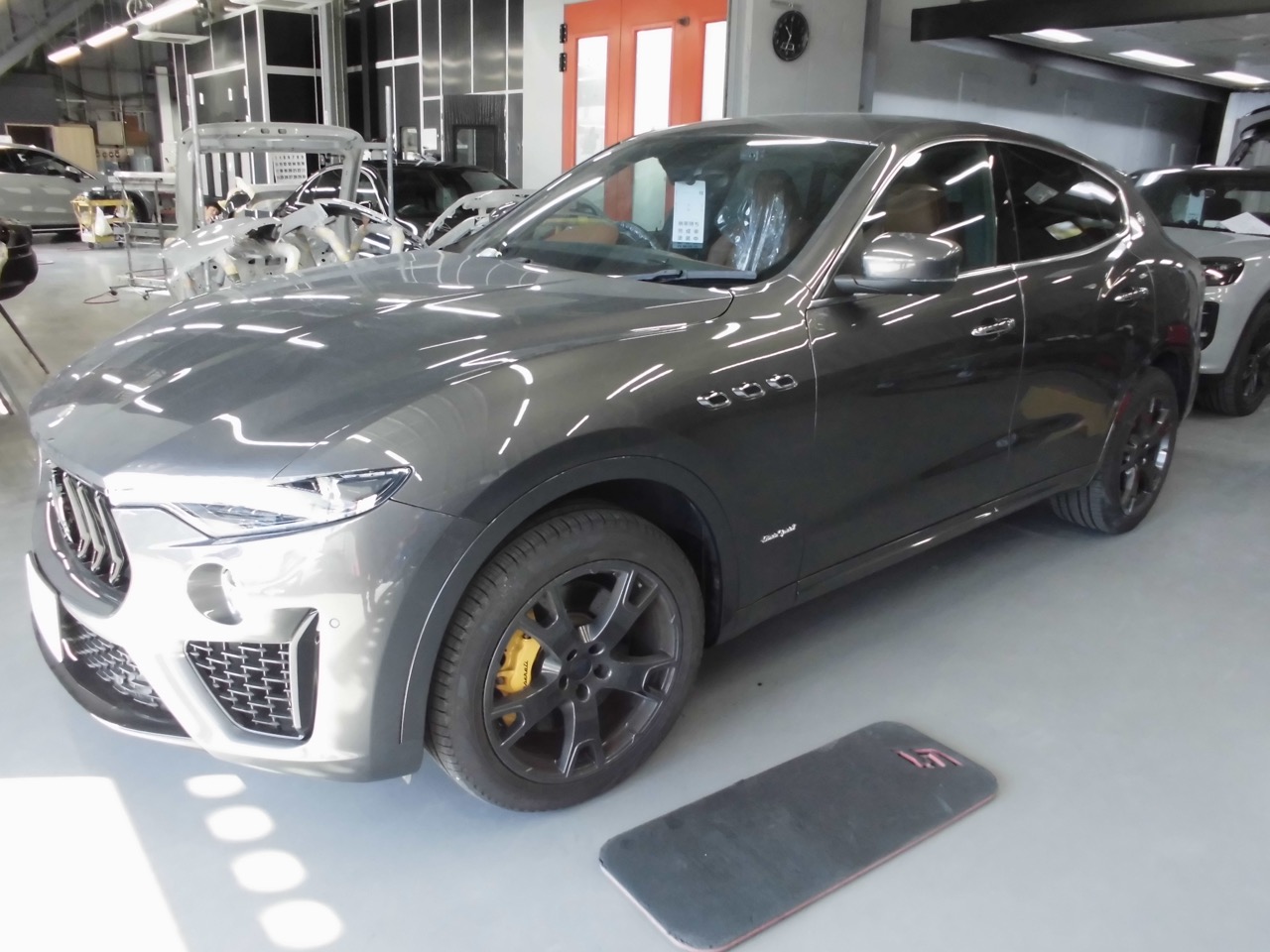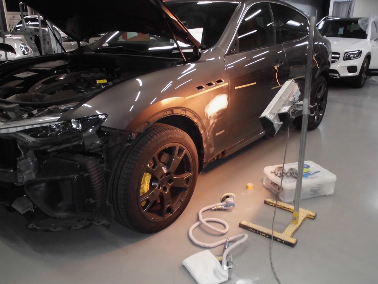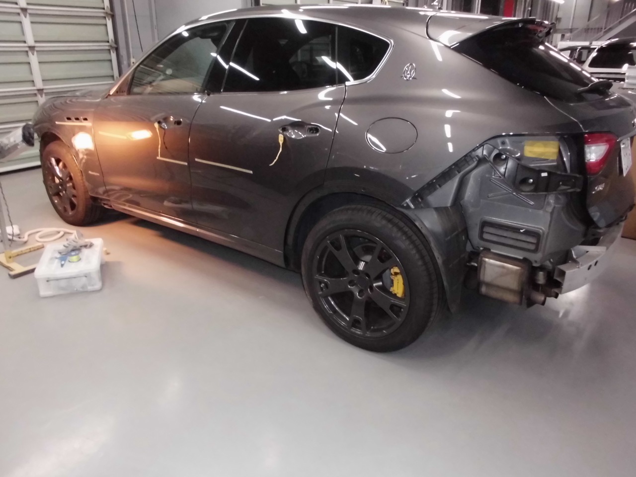 ゴミや埃の侵入を防いだ塗装ブース内で、損傷箇所の塗装作業を行います。 塗装作業完了後、取り外していた部品をすべて元通りに組み付け、洗車・最終仕上げ磨きを行い、レヴァンテの板金塗装修理が完了しました。